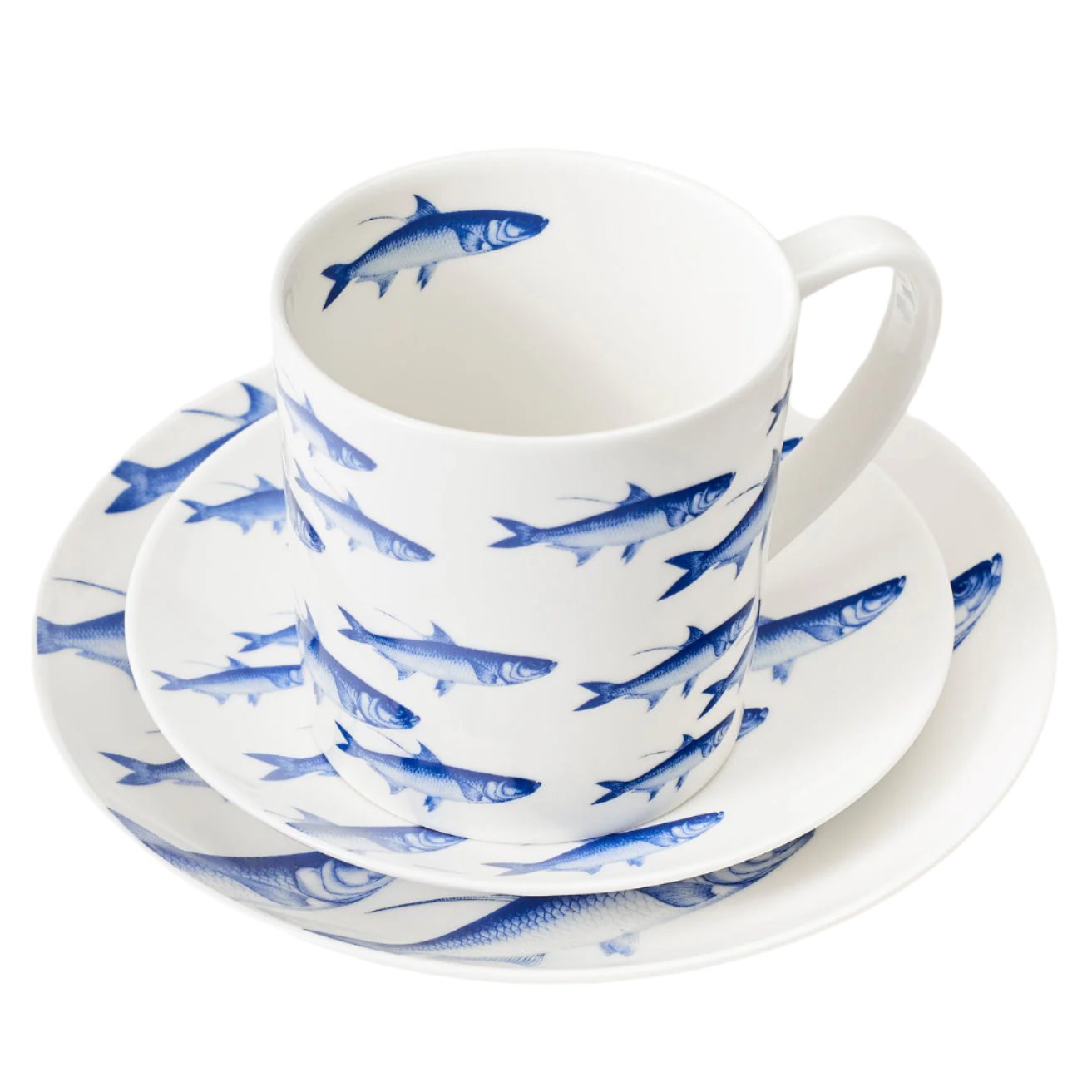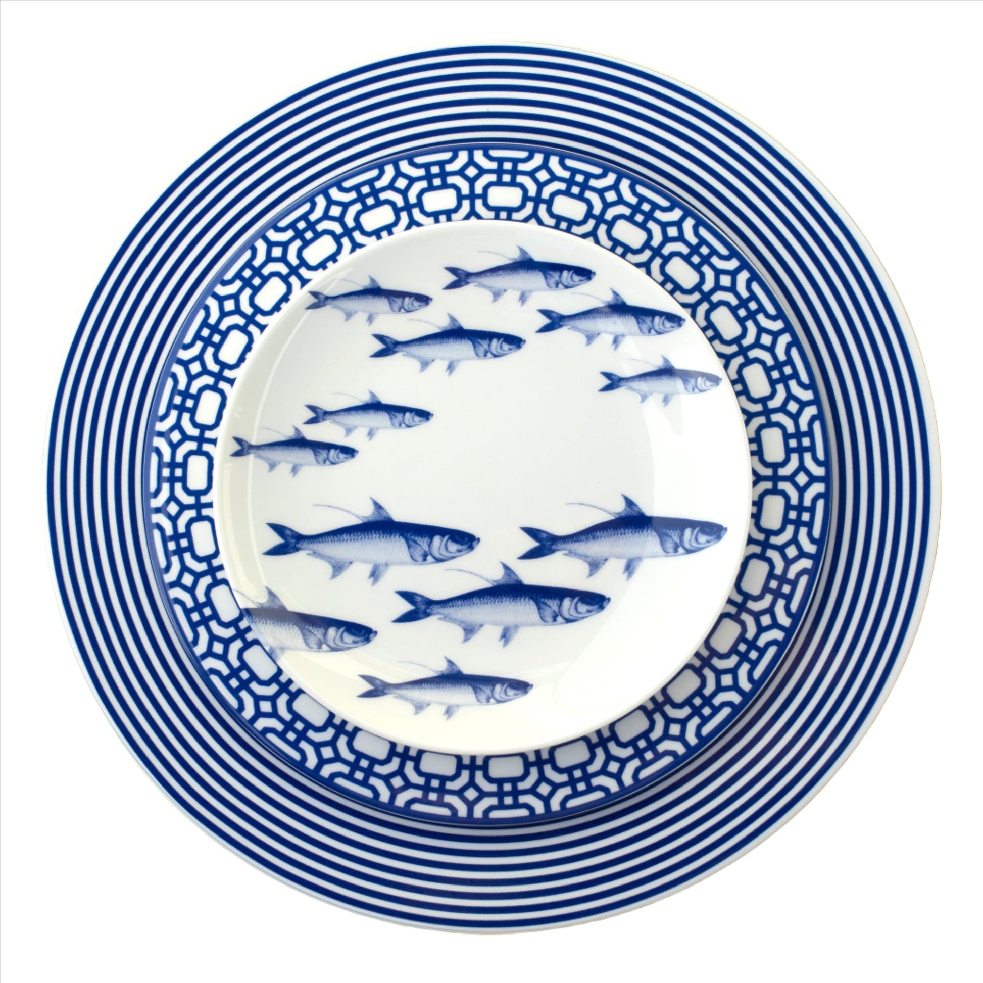 A school of fish in brilliant blue splash across this dinnerware collection with a sense of energy and motion.