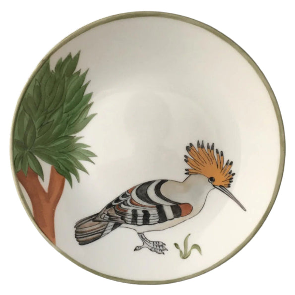 Hand-painted by one of Italy's finest porcelain decorators, Matilde Argiolas. The Hoopoe Bird Dessert Plate is a testament of exceptional Italian craftsmanship. An inspired Tropical Bird Collection motif creates a mesmerizing visual effect, complemented by a green rim. This plate is truly a fine work of exceptional craftsmanship.